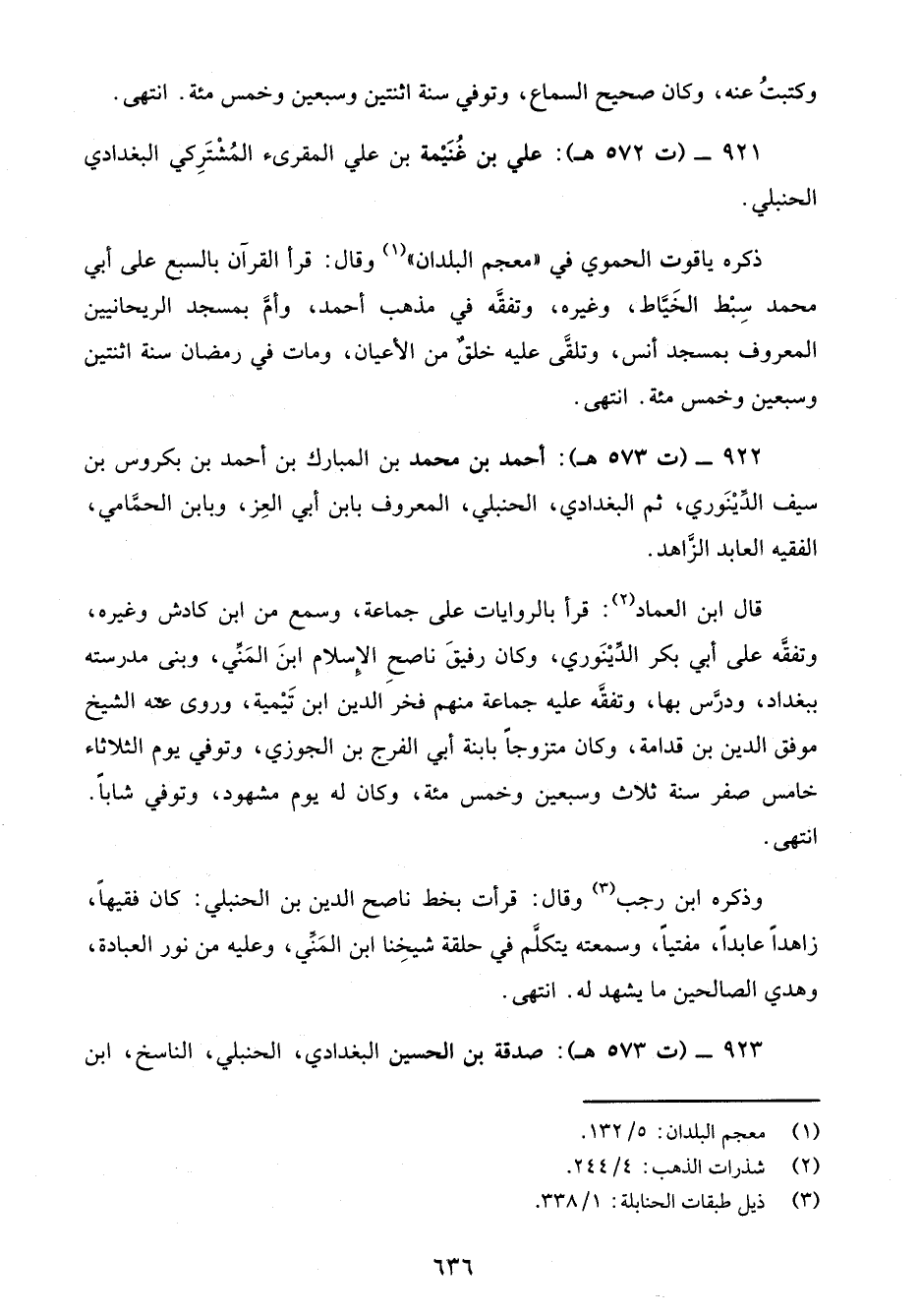 921 - (ت 572 هـ): علي بن غُنَيْمة بن علي المقرئ المُشْتَرِكي البغدادي الحنبلي.
