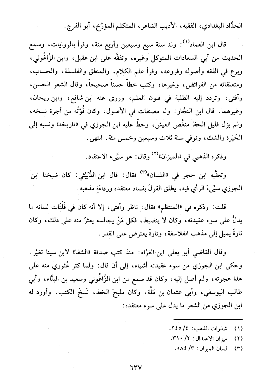 قلت: وذكره في "المنتظم" فقال: ناظر وأفتى، إلا أنه كان في فَلَتَات لسانه ما يدلُّ على سوء عقيدته، وكان لا ينضبط، فكل مَنْ يجالسه يعثرُ منه على ذلك، وكان تارةً يميل إلى مذهب الفلاسفة، وتارةً يعترض على القدر.