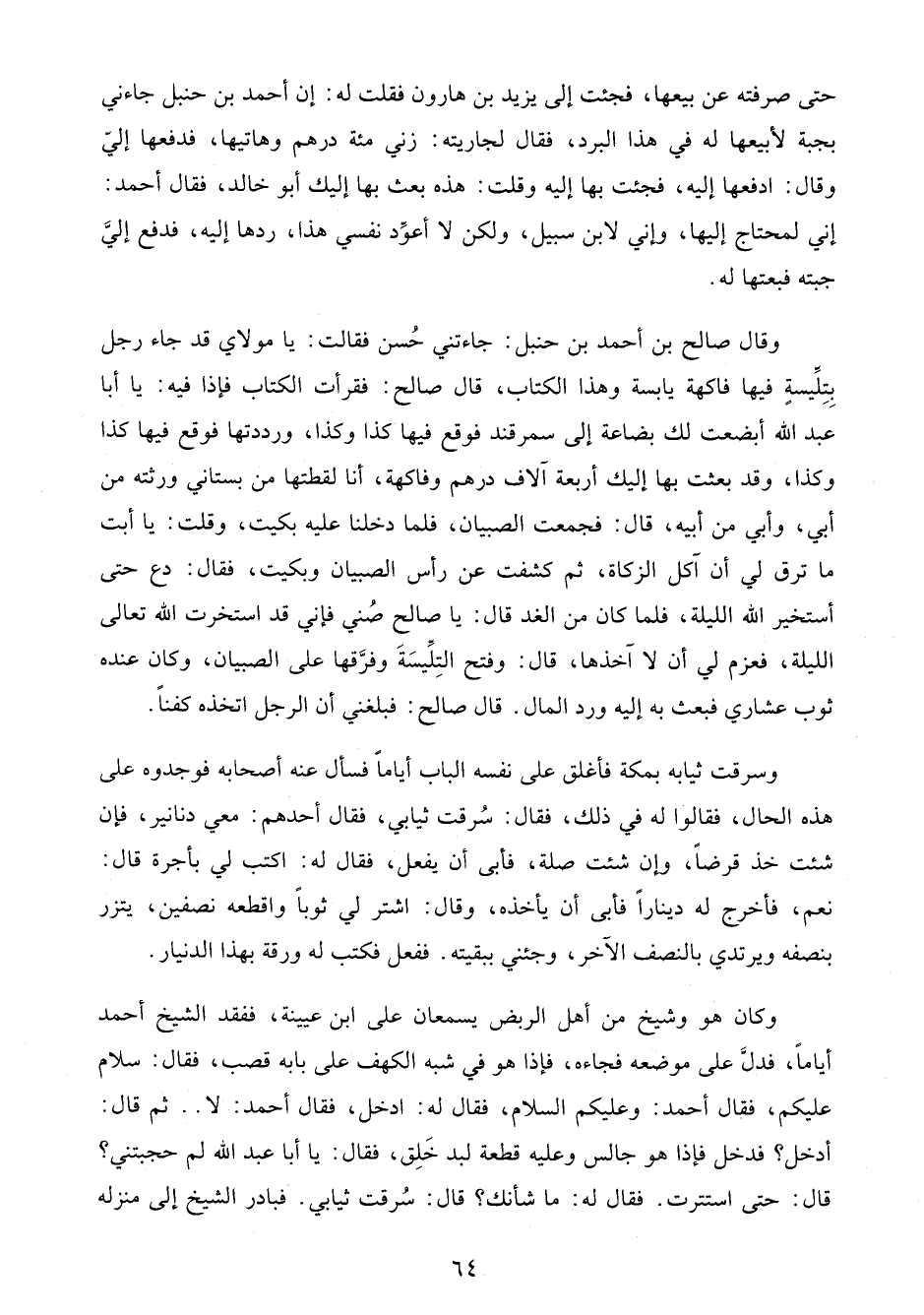 حتى صرفته عن بيعها، فجئت إلى يزيد بن هارون فقلت له: إن أحمد بن حنبل جاءني بجبة لأبيعها له في هذا البرد، فقال لجاريته: زني مئة درهم وهاتيها، فدفعها إليّ وقال: ادفعها إليه، فجئت بها إليه وقلت: هذه بعث بها إليك أبو خالد، فقال أحمد: إني لمحتاج إليها، وإني لابن سبيل، ولكن لا أعوِّد نفسي هذا، ردها إليه، فدفع إليَّ جبته فبعتها له.