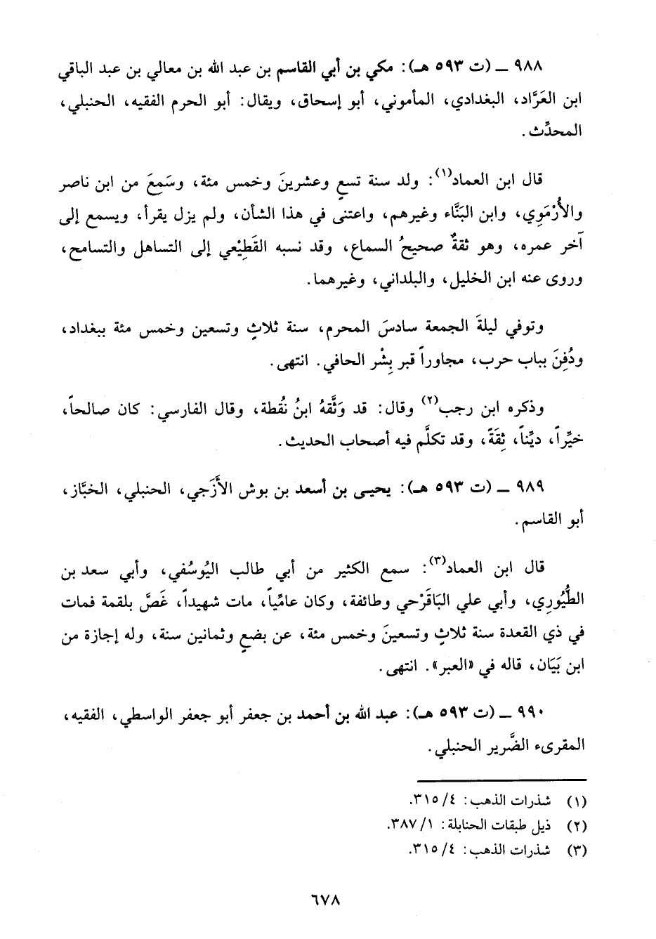 988 - (ت 593 هـ): مكي بن أبي القاسم بن عبد الله بن معالي بن عبد الباقي ابن العَرَّاد، البغدادي، المأموني، أبو إسحاق، ويقال: أبو الحرم الفقيه، الحنبلي، المحدِّث.