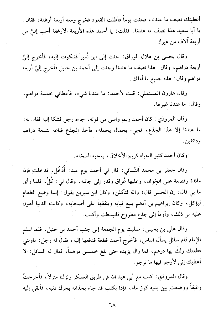 وقال يحيى بن هلال الوراق: جئت إلى ابن نُمير فشكوت إليه، فأخرج إليَّ أربعة دراهم، وقال: هذا نصف ما عندنا وجئت إلى أحمد بن حنبل فأخرج إليَّ أربعة دراهم وقال: هذه جميع ما أملك.