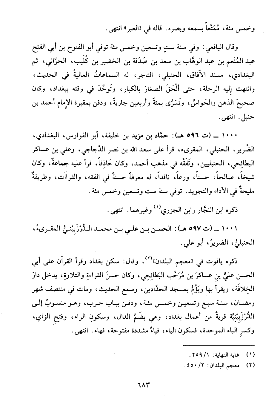 1001 - (ت 597 هـ): الحسن بن علي بن محمد الدُّرْزَبِيْنيُّ المقرئُ، الحنبليُّ، الضريرُ، أبو علي.
