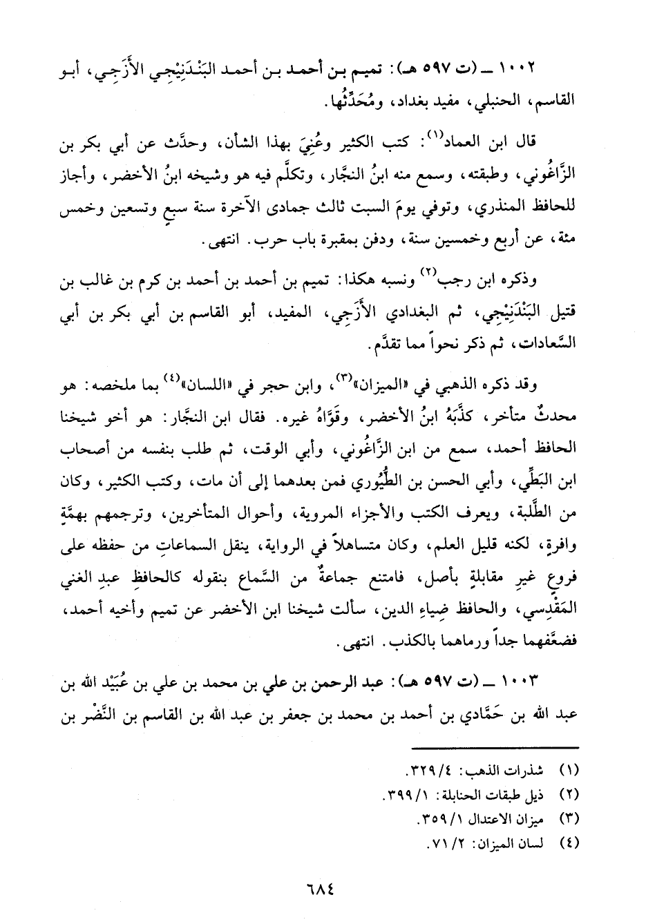 1002 - (ت 597 هـ): تميم بن أحمد بن أحمد البَنْدَنِيْجِي الأَزَجِي، أبو القاسم، الحنبلي، مفيد بغداد، ومُحَدِّثُها.