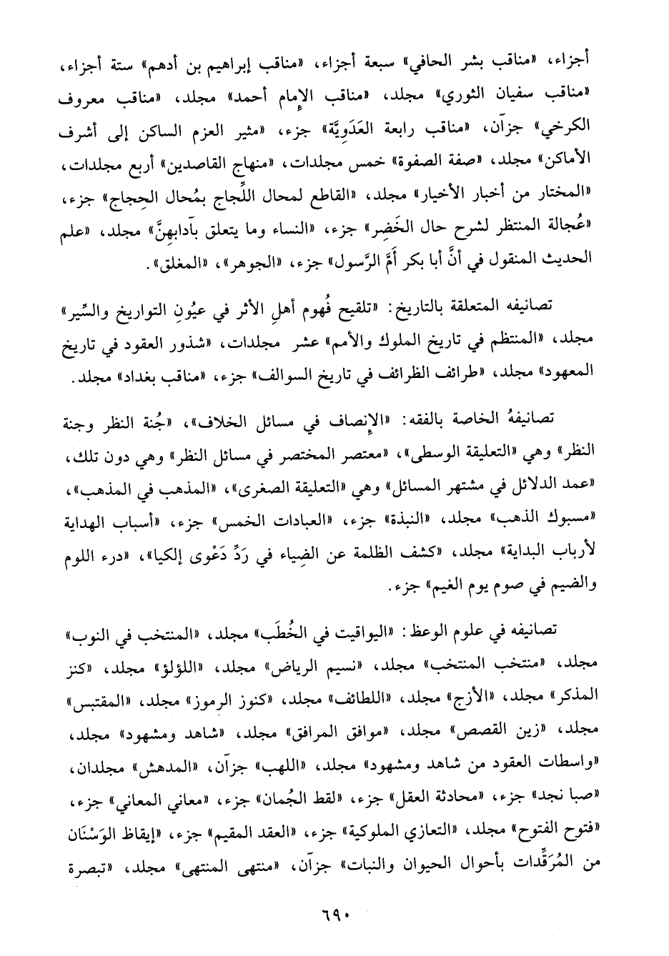 أجزاء، "مناقب بشر الحافي" سبعة أجزاء، "مناقب إبراهيم بن أدهم" ستة أجزاء، "مناقب سفيان الثوري" مجلد، "مناقب الإمام أحمد" مجلد، "مناقب معروف الكرخي" جزآن، "مناقب رابعة العَدَوِيَّة" جزء، "مثير العزم الساكن إلى أشرف الأماكن" مجلد، "صفة الصفوة" خمس مجلدات، "منهاج القاصدين" أربع مجلدات، "المختار من أخبار الأخيار" مجلد، "القاطع لمحال اللِّجاج بمُحال الحِجاج" جزء، "عُجالة المنتظر لشرح حال الخَضِر" جزء، "النساء وما يتعلق بآدابهِنَّ" مجلد، "علم الحديث المنقول في أنَّ أبا بكر أَمَّ الرَّسول" جزء، "الجوهر"، "المغلق".