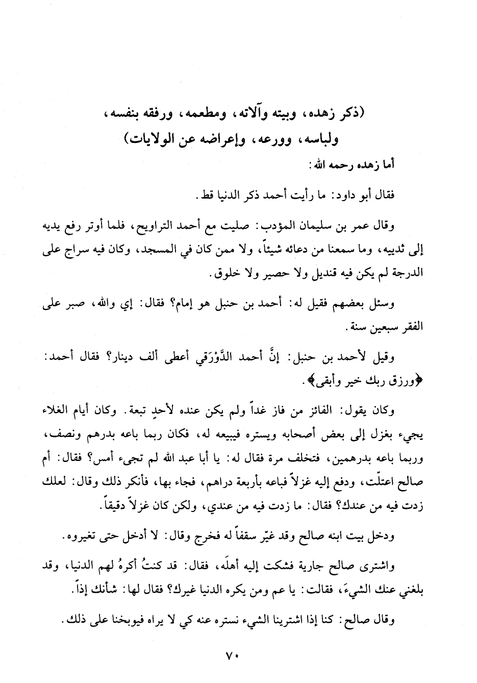 وسئل بعضهم فقيل له: أحمد بن حنبل هو إمام؟ فقال: إي والله، صبر على الفقر سبعين سنة.