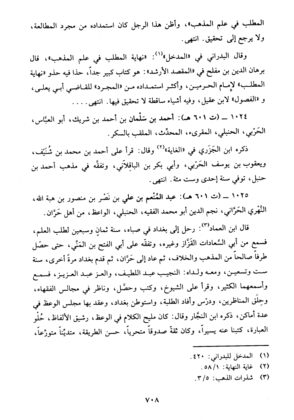 وقال البدراني في "المدخل" (¬1): "نهاية المطلب في علم المذهب"، قال برهان الدين بن مفلح في "المقصد الأرشد": هو كتاب كبير جدًا، حذا فيه حذو "نهاية المطلب" لإِمام الحرمين، وأكثر استمداده من "المجرد" للقاضي أبي يعلى، و"الفصول" لابن عقيل، وفيه أشياء ساقطة لا تحقيق فيها. انتهى ....