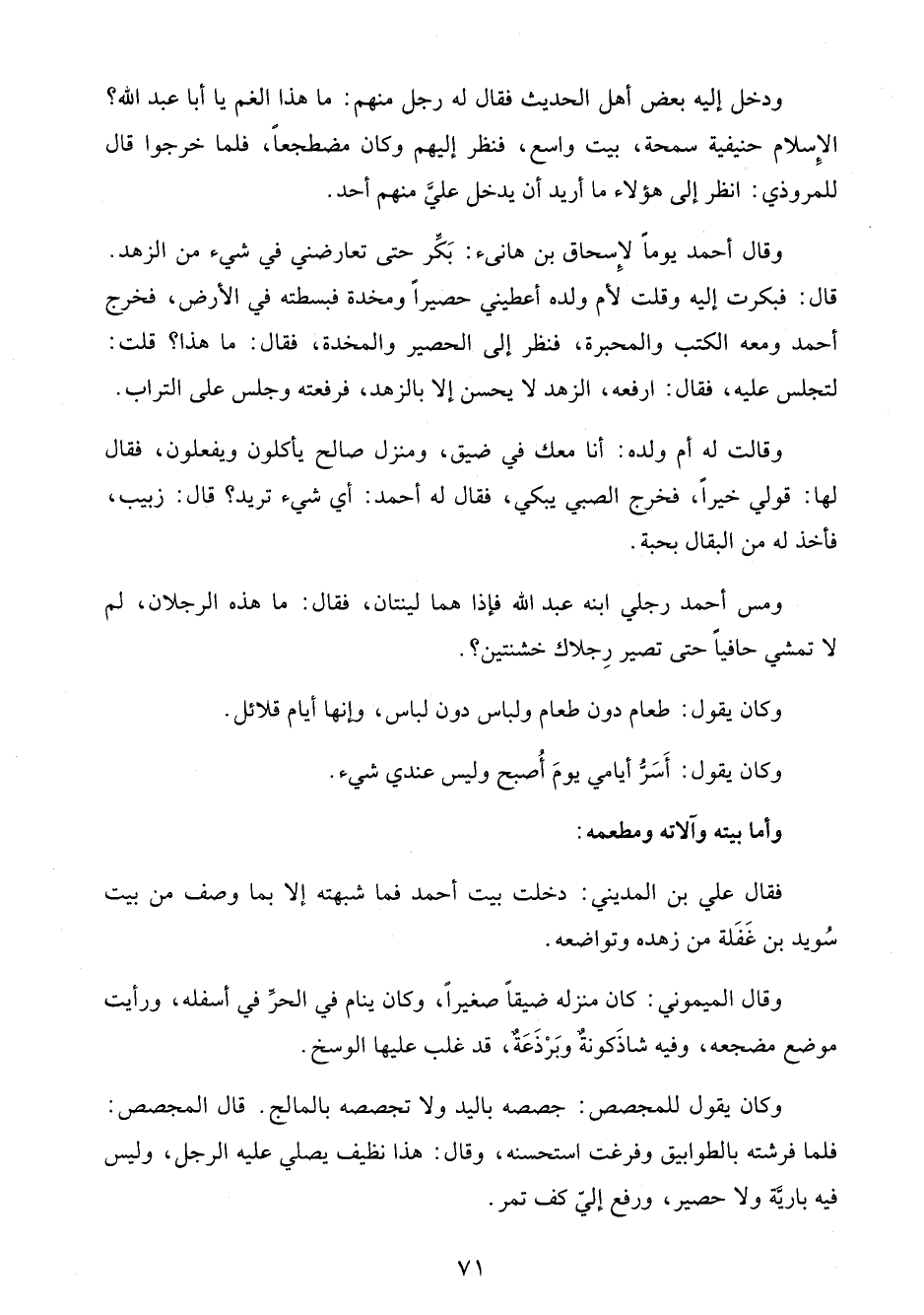 وقال أحمد يومًا لإِسحاق بن هانئ: بَكِّر حتى تعارضني في شيء من الزهد. قال: فبكرت إليه وقلت لأم ولده أعطيني حصيرًا ومخدة فبسطته في الأرض، فخرج أحمد ومعه الكتب والمحبرة، فنظر إلى الحصير والمخدة، فقال: ما هذا؟ قلت: لتجلس عليه، فقال: ارفعه، الزهد لا يحسن إلا بالزهد، فرفعته وجلس على التراب.