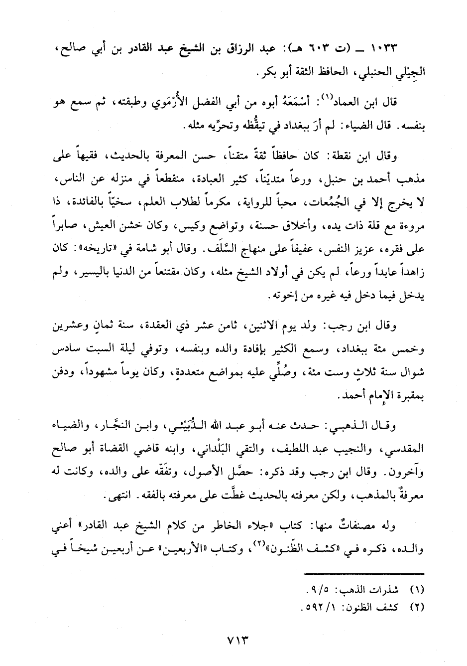 1033 - (ت 603 هـ): عبد الرزاق بن الشيخ عبد القادر بن أبي صالح، الجِيْلي الحنبلي، الحافظ الثقة أبو بكر.