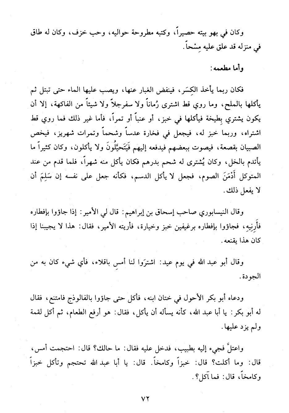 فكان ربما يأخذ الكِسَر، فينفض الغبار عنها، ويصب عليها الماء حتى تبتل ثم يأكلها بالملح، وما روي قط اشترى رُمانًا ولا سفرجلًا ولا شيئًا من الفاكهة، إلا أن يكون يشتري بِطيخة فيأكلها في خبز، أو عنبًا أو تمرًا، فأما غير ذلك فما روي قط اشتراه، وربما خبز له، فيجعل في فخارة عدسًا وشحمًا وتمرات شهريز، فيخص الصبيان بقصعة، فيصوت ببعضهم فيدفعه إليهم فَيَتَحيَّلُونَ ولا يأكلون، وكان كثيرًا ما يأتدم بالخل، وكان يُشترى له شحم بدرهم فكان يأكل منه شهرًا، فلما قدم من عند المتوكل أَدْمَنَ الصوم، فجعل لا يأكل الدسم، فكأنه جعل على نفسه إن سَلِمَ أن لا يفعل ذلك.