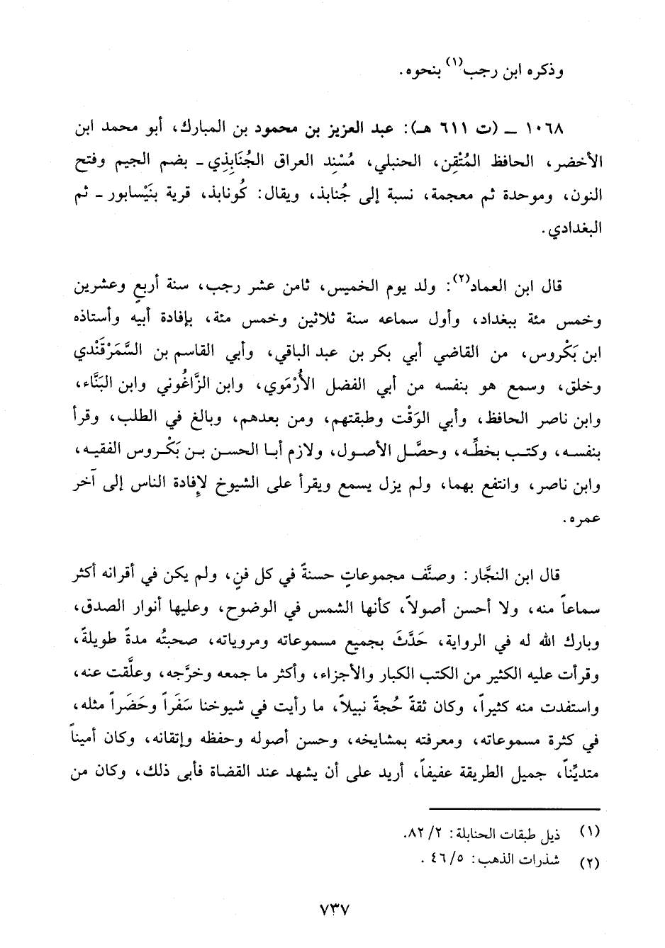 1068 - (ت 611 هـ): عبد العزيز بن محمود بن المبارك، أبو محمد ابن الأخضر، الحافظ المُتْقِن، الحنبلي، مُسْنِد العراق الجُنَابِذِي - بضم الجيم وفتح النون، وموحدة ثم معجمة، نسبة إلى جُنابذ، ويقال: كُونابذ، قرية بنَيْسابور - ثم البغدادي.