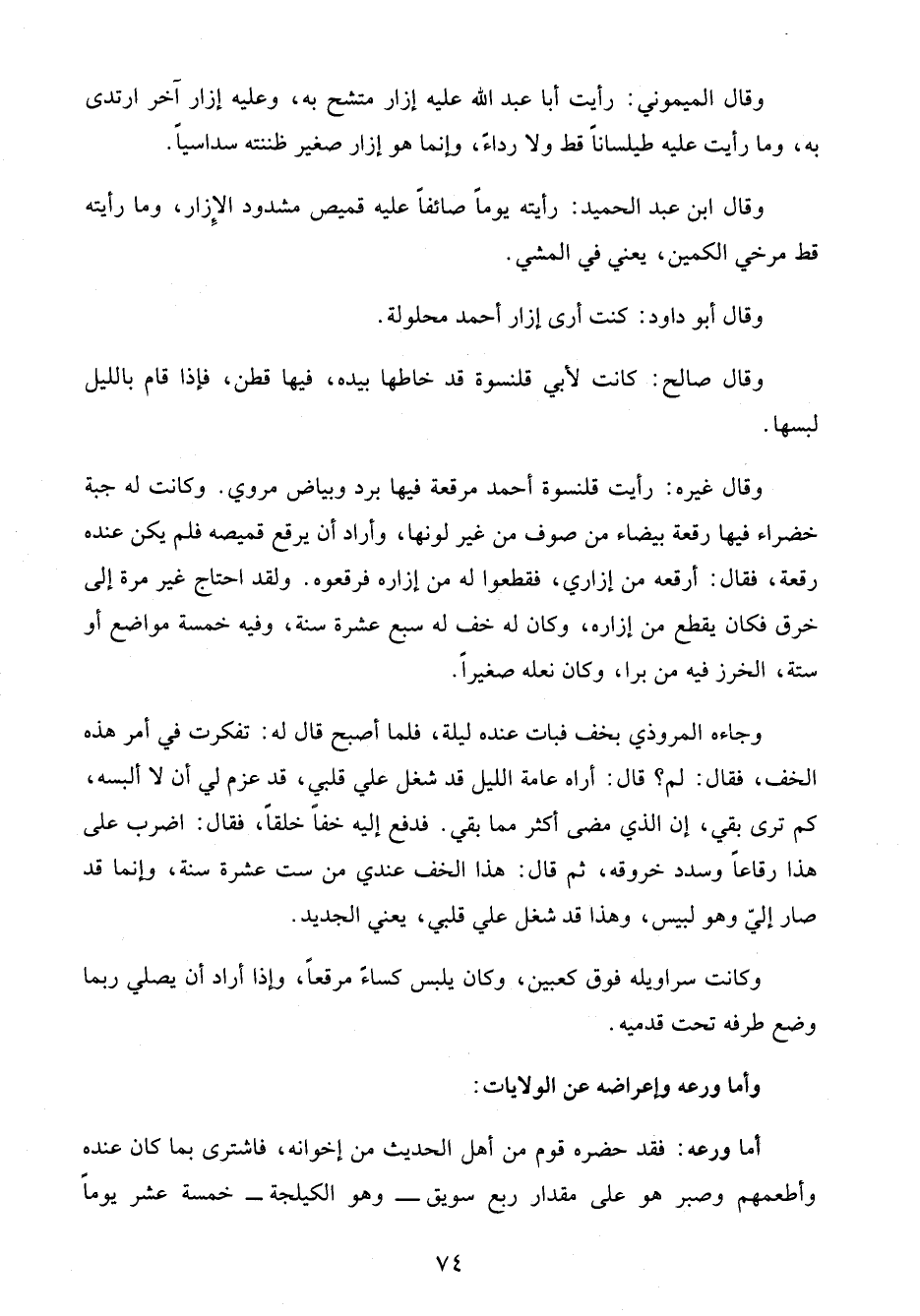 وقال غيره: رأيت قلنسوة أحمد مرقعة فيها برد وبياض مروي. وكانت له جبة خضراء فيها رقعة بيضاء من صوف من غير لونها، وأراد أن يرقع قميصه فلم يكن عنده رقعة، فقال: أرقعه من إزاري، فقطعوا له من إزاره فرقعوه. ولقد احتاج غير مرة إلى خرق فكان يقطع من إزاره، وكان له خف له سبع عشرة سنة، وفيه خمسة مواضع أو ستة، الخرز فيه من برا، وكان نعله صغيرًا.