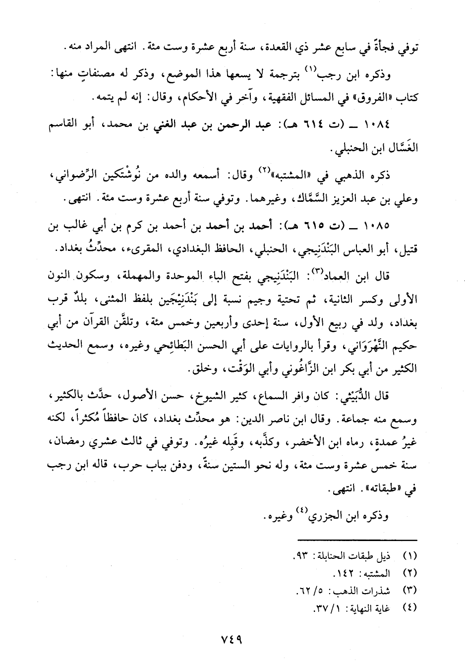 1085 - (ت 615 هـ): أحمد بن أحمد بن أحمد بن كرم بن أبي غالب بن قتيل، أبو العباس البَنْدَنِيجي، الحنبلي، الحافظ البغدادي، المقرئ، محدِّثُ بغداد.