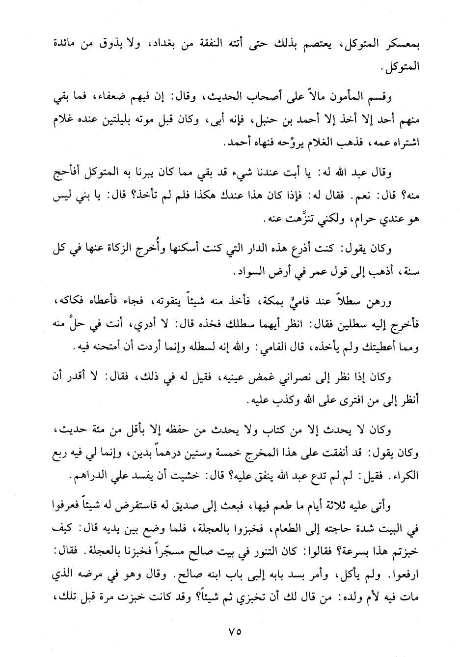 وقال عبد الله له: يا أبت عندنا شيء قد بقي مما كان يبرنا به المتوكل أفأحج منه؟ قال: نعم. فقال له: فإذا كان هذا عندك هكذا فلم لم تأخذ؟ قال: يا بني ليس هو عندي حرام، ولكني تنزَّهت عنه.