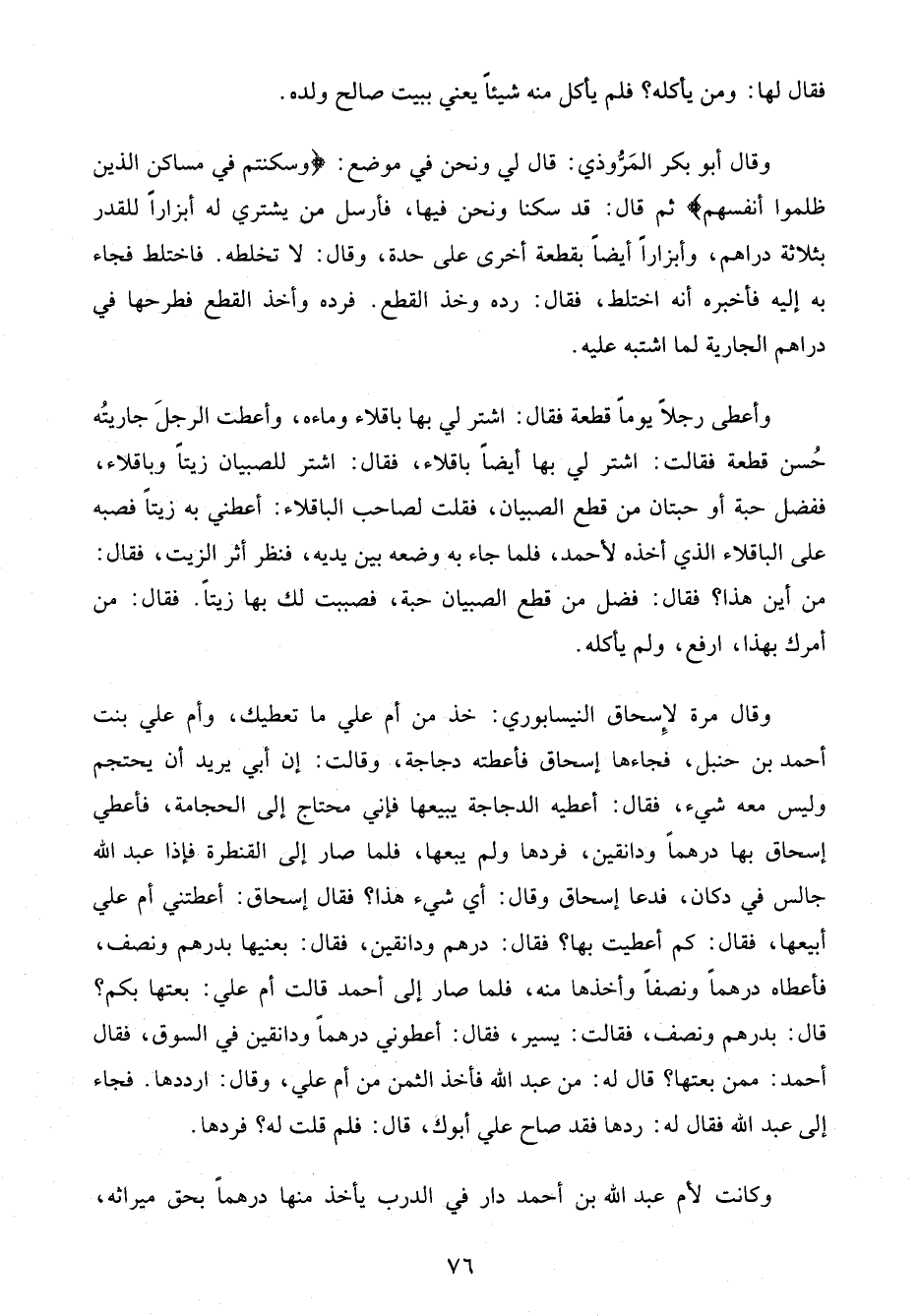 وأعطى رجلًا يومًا قطعة فقال: اشتر لي بها باقلاء وماءه، وأعطت الرجلَ جاريتُه حُسن قطعة فقالت: اشتر لي بها أيضًا باقلاء، فقال: اشتر للصبيان زيتًا وباقلاء، ففضل حبة أو حبتان من قطع الصبيان، فقلت لصاحب الباقلاء: أعطني به زيتًا فصبه على الباقلاء الذي أخذه لأحمد، فلما جاء به وضعه بين يديه، فنظر أثر الزيت، فقال: من أين هذا؟ فقال: فضل من قطع الصبيان حبة، فصببت لك بها زيتًا. فقال: من أمرك بهذا، ارفع، ولم يأكله.