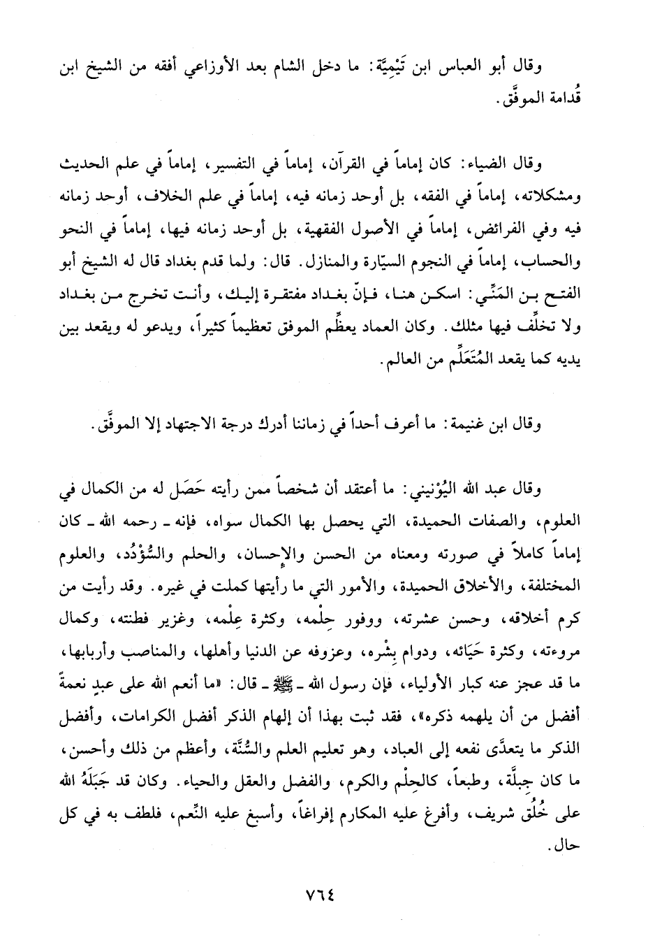 وقال ابن غنيمة: ما أعرف أحدًا في زماننا أدرك درجة الاجتهاد إلا الموفَّق.