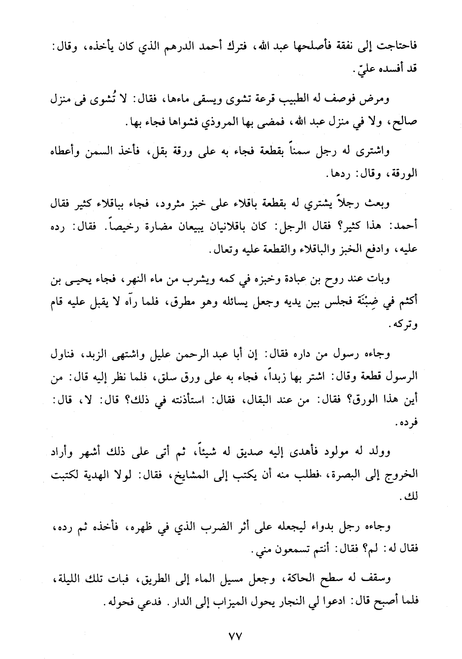 وبعث رجلًا يشتري له بقطعة باقلاء على خبز مثرود، فجاء بباقلاء كثير فقال أحمد: هذا كثير؟ فقال الرجل: كان باقلانيان يبيعان مضارة رخيصًا. فقال: رده عليه، وادفع الخبز والباقلاء والقطعة عليه وتعال.