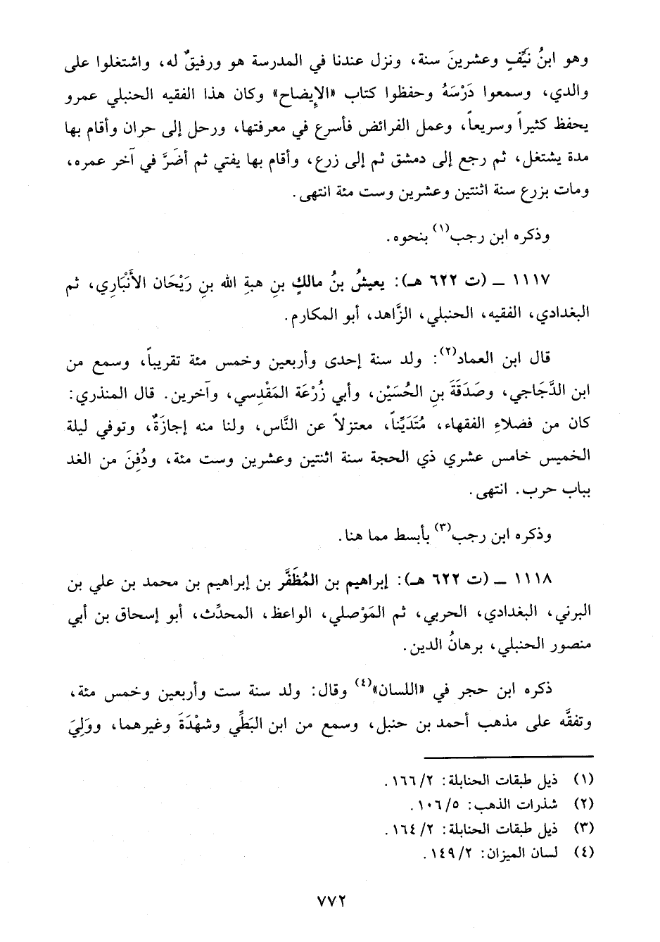 1117 - (ت 622 هـ): يعيشُ بنُ مالكٍ بنِ هبةِ الله بنِ رَيْحَان الأَنْبَارِي، ثم البغدادي، الفقيه، الحنبلي، الزَّاهد، أبو المكارم.