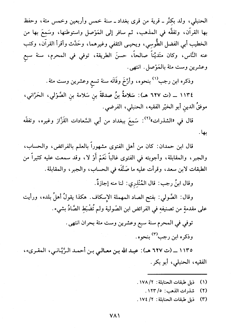 1134 - (ت 627 هـ): سَلامةُ بنُ صدقةَ بنِ سَلامة بنِ الصَّوْلي، الحَرَّاني، موفقُ الدينِ أبو الخيّر الفقيه، الحنبلي، الفرضي.