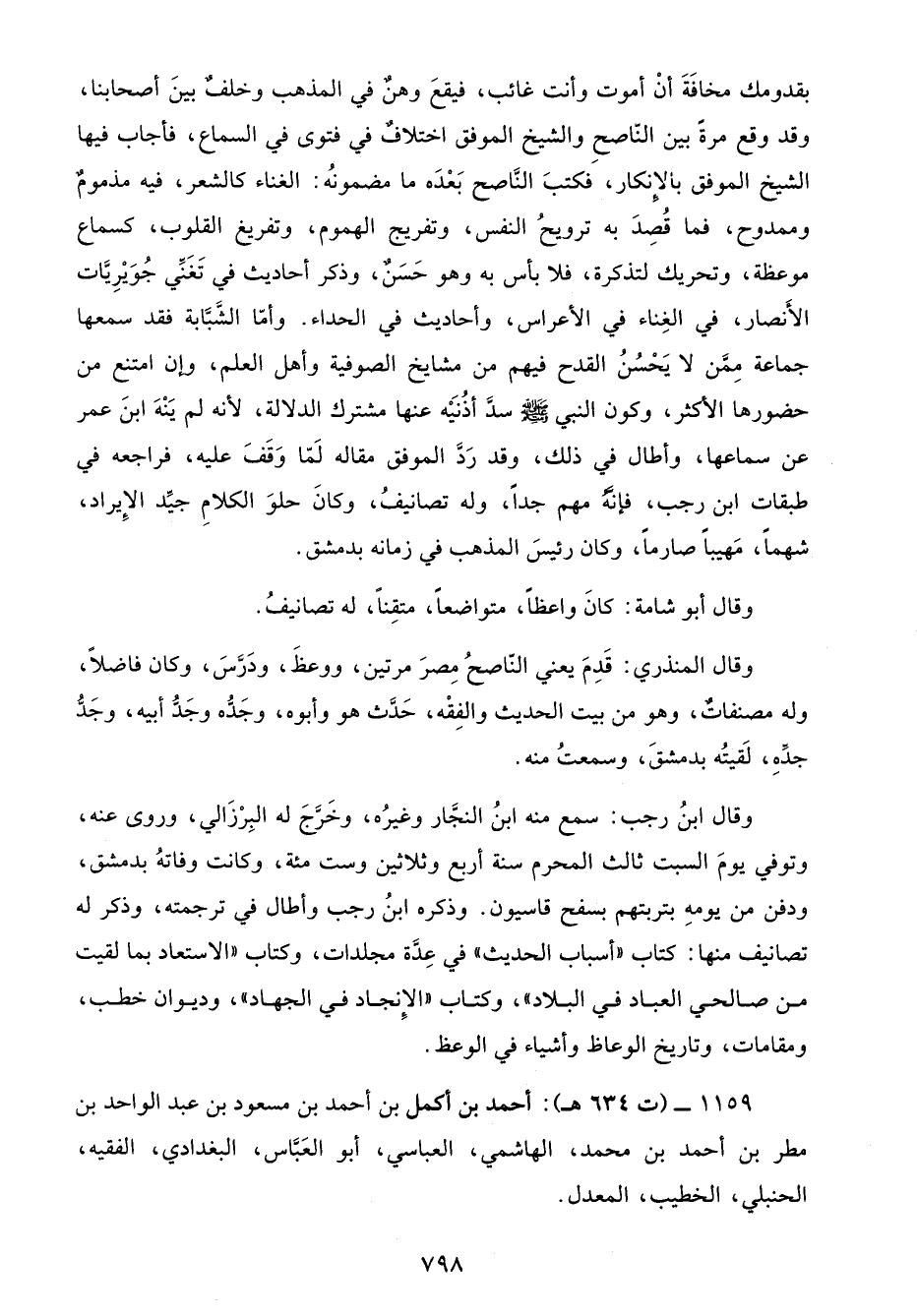 بقدومك مخافَةَ أنْ أموت وأنت غائب، فيقعَ وهنٌ في المذهب وخلفٌ بينَ أصحابنا، وقد وقع مرةً بين النّاصحِ والشيخ الموفق اختلافٌ في فتوى في السماع، فأجاب فيها الشيخ الموفق بالإِنكار، فكتبَ النَّاصح بَعْدَه ما مضمونُه: الغناء كالشعر، فيه مذمومٌ وممدوح، فما قُصِدَ به ترويحُ النفس، وتفريج الهموم، وتفريغ القلوب، كسماع موعظة، وتحريك لتذكرة، فلا بأس به وهو حَسَنٌ، وذكر أحاديث في تَغَنَّي جُوَيْرِيَّات الأَنصار، في الغِناء في الأعراس، وأحاديث في الحداء. وأمّا الشَّبَّابة فقد سمعها جماعة مِمَّن لا يَحْسُنُ القدح فيهم من مشايخ الصوفية وأهل العلم، وإن امتنع من حضورها الأكثر، وكون النبي - صلى الله عليه وسلم - سدَّ أذُنَيْه عنها مشترك الدلالة، لأنه لم يَنْهَ ابنَ عمر عن سماعها، وأطال في ذلك، وقد رَدَّ الموفق مقاله لَمّا وَقَفَ عليه، فراجعه في طبقات ابن رجب، فإنَّهُ مهم جدًا، وله تصانيفُ، وكانَ حلوَ الكلامِ جيَّد الإِيراد، شهمًا، مَهيبًا صارمًا، وكان رئيسَ المذهب في زمانه بدمشق.