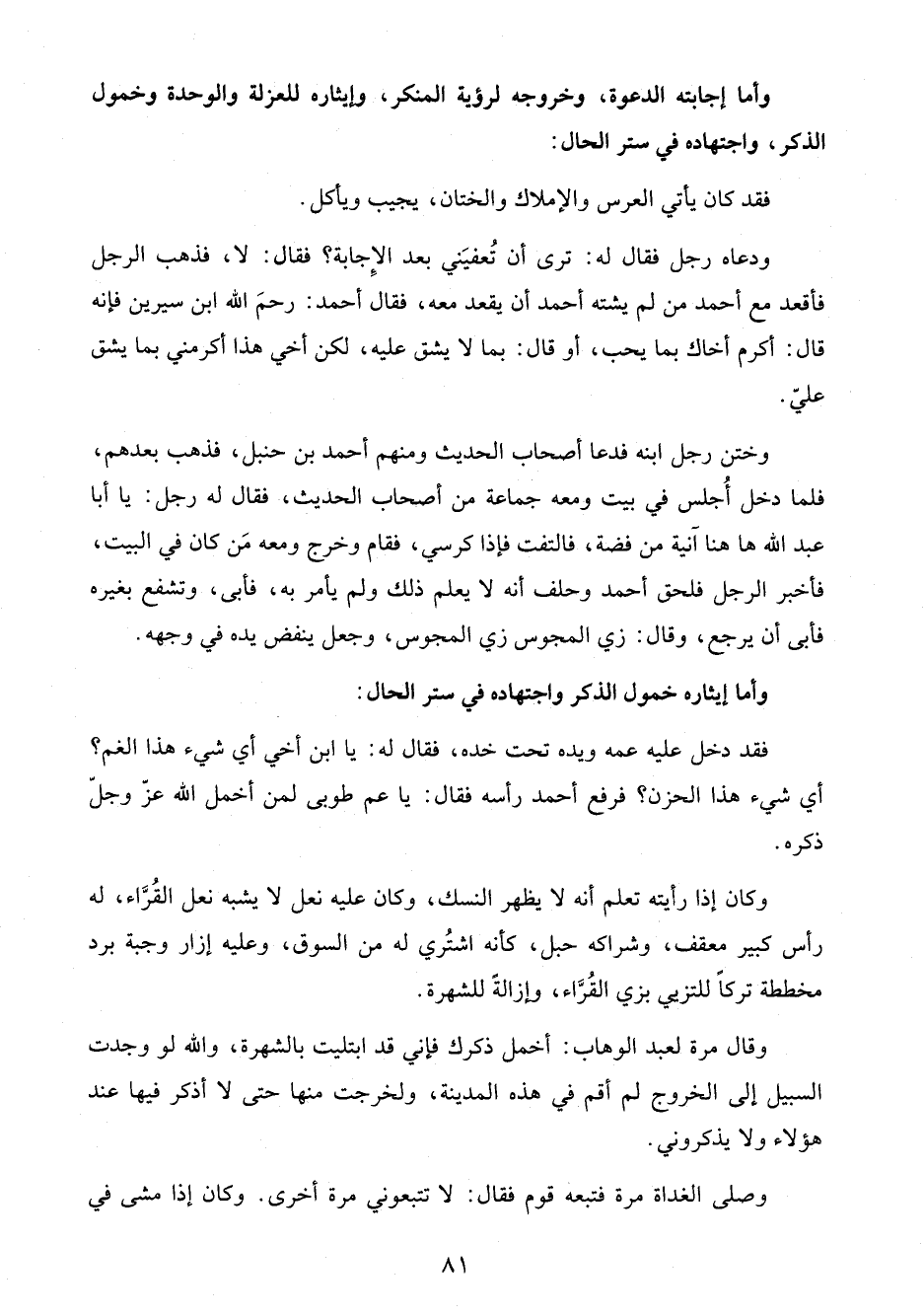 ودعاه رجل فقال له: ترى أن تُعفيَني بعد الإِجابة؟ فقال: لا، فذهب الرجل فأقعد مع أحمد من لم يشته أحمد أن يقعد معه، فقال أحمد: رحمَ الله ابن سيرين فإنه قال: أكرم أخاك بما يحب، أو قال: بما لا يشق عليه، لكن أخي هذا أكرمني بما يشق عليّ.