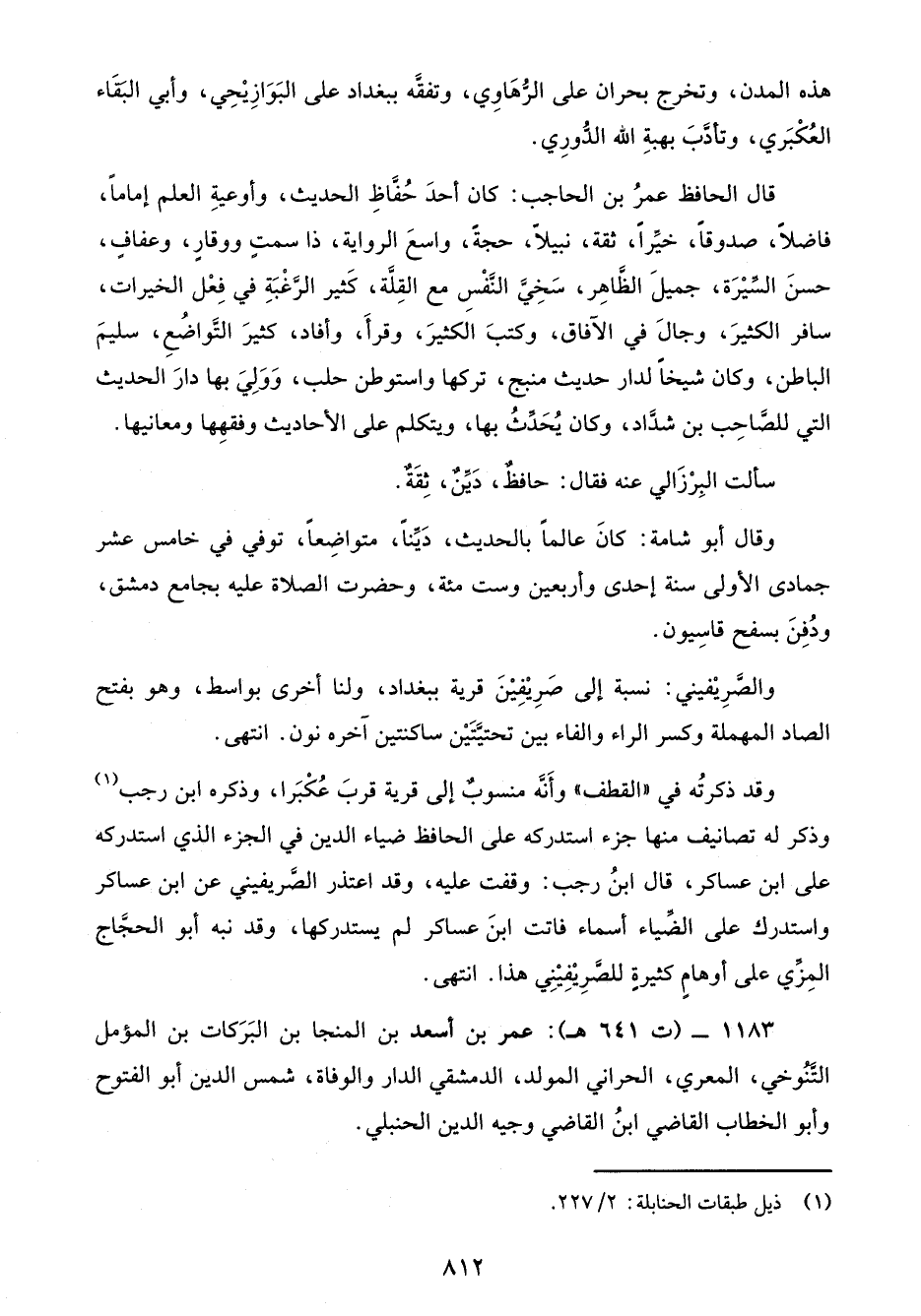 1183 - (ت 641 هـ): عمر بن أسعد بن المنجا بن البَرَكات بن المؤمل التَّنُوخي، المعري، الحراني المولد، الدمشقي الدار والوفاة، شمس الدين أبو الفتوح وأبو الخطاب القاضي ابنُ القاضي وجيه الدين الحنبلي.