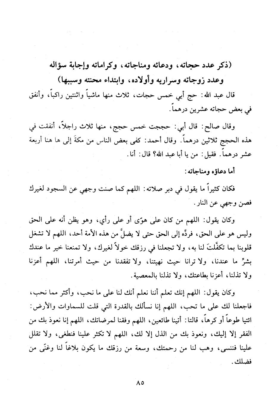 قال عبد الله: حج أبي خمس حجات، ثلاث منها ماشيًا واثنتين راكبًا، وأنفق في بعض حجاته عشرين درهمًا.