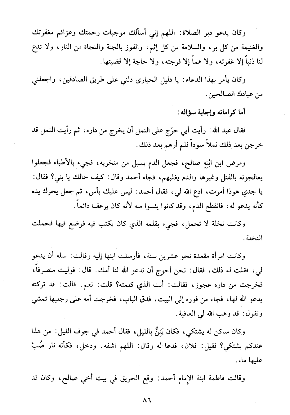 ومرض ابن ابْنِهِ صالح، فجعل الدم يسيل من منخريه، فجيء بالأطباء فجعلوا يعالجونه بالفتل وغيرها والدم يغلبهم، فجاء أحمد وقال: كيف حالك يا بني؟ فقال: يا جدي هوذا أموت، ادع الله لي، فقال أحمد: ليس عليك بأس، ثم جعل يحرك يده كأنه يدعو له، فانقطع الدم، وقد كانوا يئسوا منه لأنه كان يرعف دائمًا.