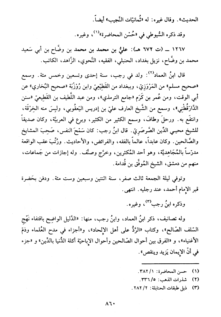 1267 - (ت 672 هـ): عليُّ بن محمد بن محمد بن وضَّاح بن أبي سَعيد محمد بن وضَّاح، نزيل بغداد، الحنبلي، الفقيه، النَّحوي، الزَّاهد، الكاتب.