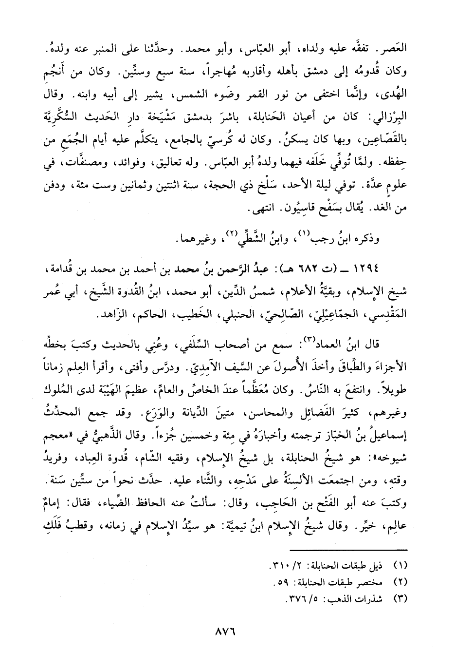 1294 - (ت 682 هـ): عبدُ الرَّحمن بنُ محمد بن أحمد بن محمد بن قُدامة، شيخ الإِسلام، وبقيَّةُ الأعلام، شمسُ الدَّين، أبو محمد، ابنُ القُدوة الشَّيخ، أبي عُمر المَقْدِسي، الجمّاعِيْلِيّ، الصَّالِحيّ، الحنبلي، الخَطيب، الحاكم، الزَّاهد.