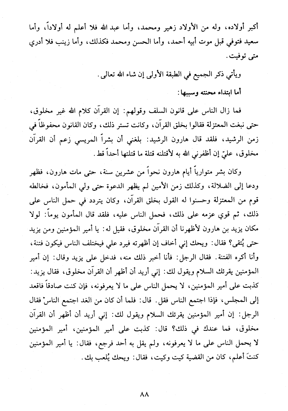 فما زال الناس على قانون السلف وقولهم: إن القرآن كلام الله غير مخلوق، حتى نبغت المعتزلة فقالوا بخلق القرآن، وكانت تستر ذلك، وكان القانون محفوظًا في زمن الرشيد، فلقد قال هارون الرشيد: بلغني أن بشرًا المريسي زعم أن القرآن مخلوق، عليّ إن أظفرني الله به لأقتلنه قتلة ما قتلتها أحدًا قط.