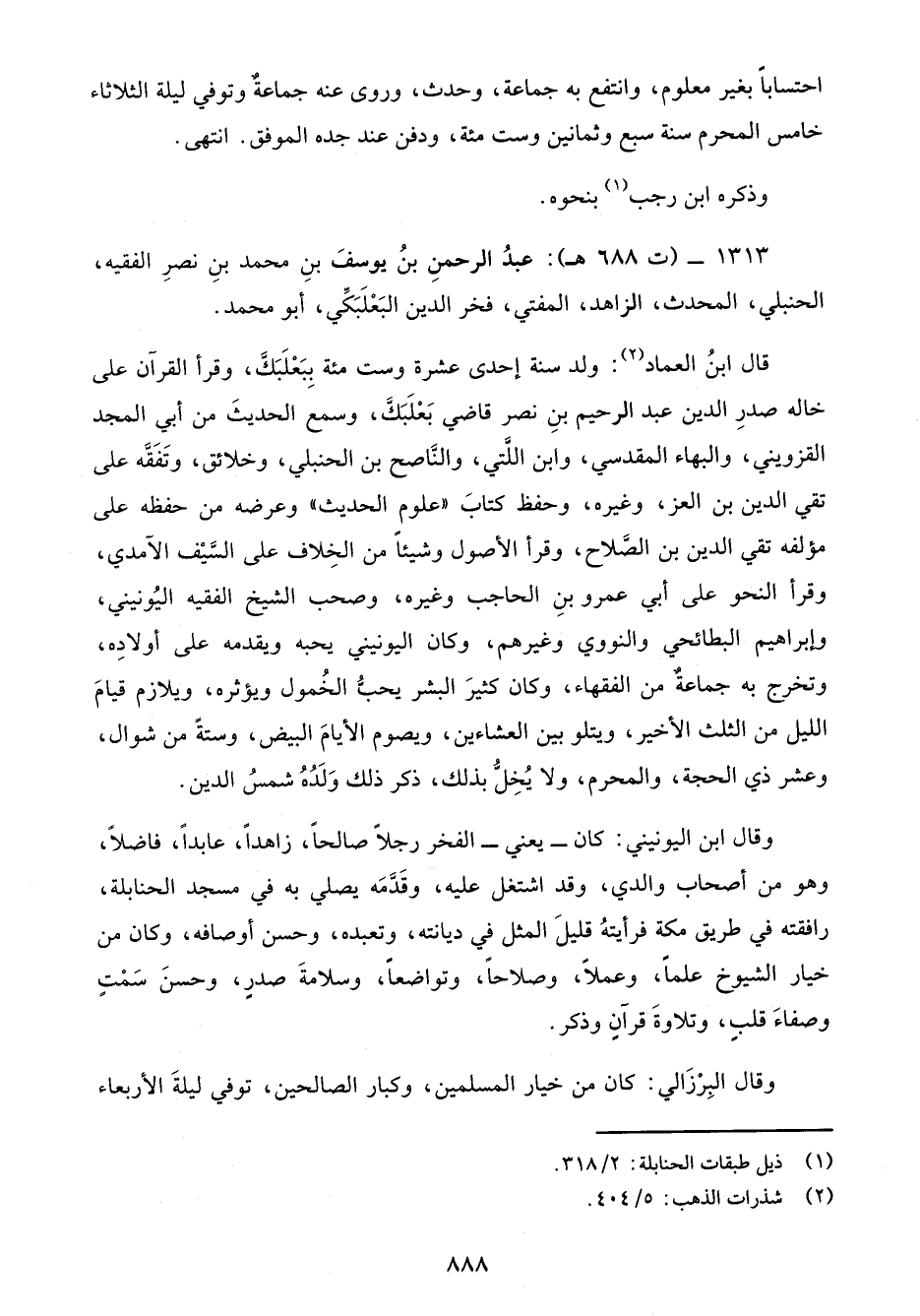 1313 - (ت 688 هـ): عبدُ الرحمنِ بنُ يوسفَ بنِ محمد بنِ نصرِ الفقيه، الحنبلي، المحدث، الزاهد، المفتي، فخر الدين البَعْلَبَكِّي، أبو محمد.