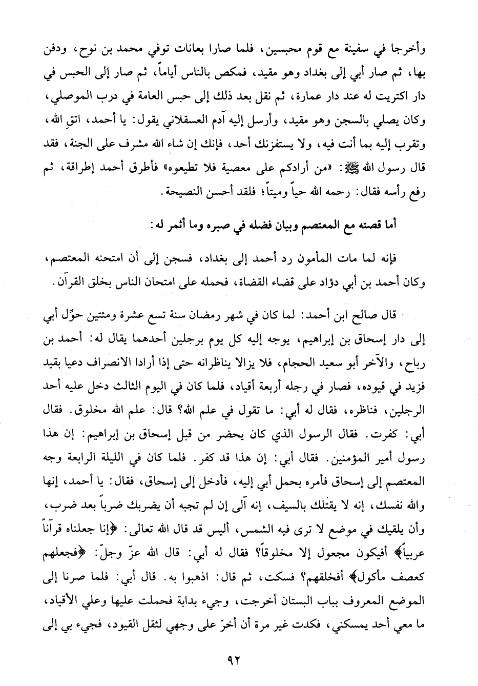 وأخرجا في سفينة مع قوم محبسين، فلما صارا بعانات توفي محمد بن نوح، ودفن بها، ثم صار أبي إلى بغداد وهو مقيد، فمكص بالناس أيامًا، ثم صار إلى الحبس في دار اكتريت له عند دار عمارة، ثم نقل بعد ذلك إلى حبس العامة في درب الموصلي، وكان يصلي بالسجن وهو مقيد، وأرسل إليه آدم العسقلاني يقول: يا أحمد، اتقِ الله، وتقرب إليه بما أنت فيه، ولا يستفزنك أحد، فإنك إن شاء الله مشرف على الجنة، فقد قال رسول الله - صلى الله عليه وسلم -: "من أرادكم على معصية فلا تطيعوه" فأطرق أحمد إطراقة، ثم رفع رأسه فقال: رحمه الله حيًا وميتًا؛ فلقد أحسن النصيحة.