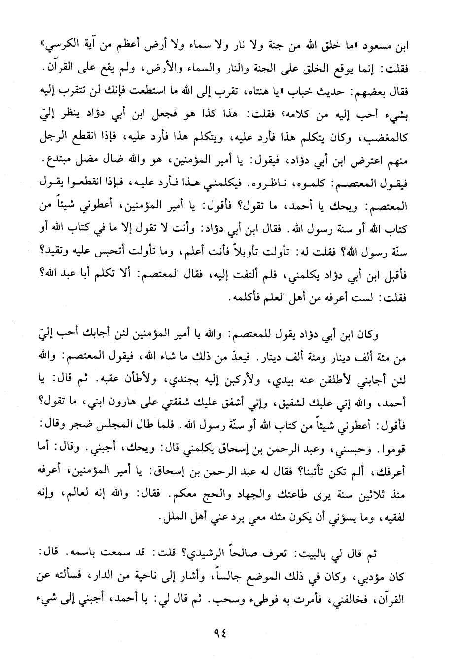 ابن مسعود "ما خلق الله من جنة ولا نار ولا سماء ولا أرض أعظم من آية الكرسي" فقلت: إنما يوقع الخلق على الجنة والنار والسماء والأرض، ولم يقع على القرآن. فقال بعضهم: حديث خباب "يا هنتاه، تقرب إلى الله ما استطعت فإنك لن تتقرب إليه بشيء أحب إليه من كلامه" فقلت: هذا كذا هو فجعل ابن أبي دؤاد ينظر إليّ كالمغضب، وكان يتكلم هذا فأرد عليه، ويتكلم هذا فأرد عليه، فإذا انقطع الرجل منهم اعترض ابن أبي دؤاد، فيقول: يا أمير المؤمنين، هو والله ضال مضل مبتدع. فيقول المعتصم: كلموه، ناظروه. فيكلمني هذا فأرد عليه، فإذا انقطعوا يقول المعتصم: ويحك يا أحمد، ما تقول؟ فأقول: يا أمير المؤمنين، أعطوني شيئًا من كتاب الله أو سنة رسول الله. فقال ابن أبي دؤاد: وأنت لا تقول إلا ما في كتاب الله أو سنّة رسول الله؟ فقلت له: تأولت تأويلًا فأنت أعلم، وما تأولت أتحبس عليه وتقيد؟ فأقبل ابن أبي دؤاد يكلمني، فلم ألتفت إليه، فقال المعتصم: ألا تكلم أبا عبد الله؟ فقلت: لست أعرفه من أهل العلم فأكلمه.