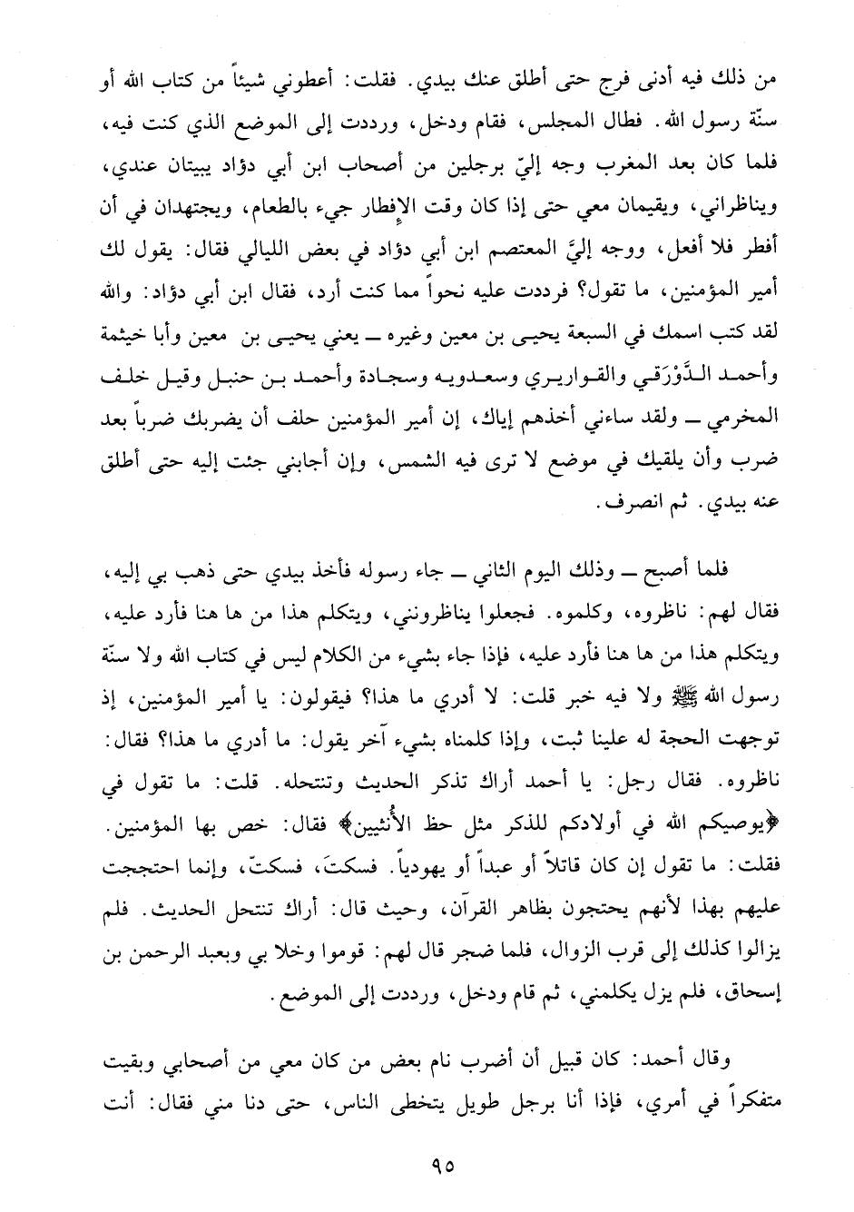 فلما أصبح - وذلك اليوم الثاني - جاء رسوله فأخذ بيدي حتى ذهب بي إليه، فقال لهم: ناظروه، وكلموه. فجعلوا يناظرونني، ويتكلم هذا من ها هنا فأرد عليه، ويتكلم هذا من ها هنا فأرد عليه، فإذا جاء بشيء من الكلام ليس في كتاب الله ولا سنّة رسول الله - صلى الله عليه وسلم - ولا فيه خبر قلت: لا أدري ما هذا؟ فيقولون: يا أمير المؤمنين، إذ توجهت الحجة له علينا ثبت، وإذا كلمناه بشيء آخر يقول: ما أدري ما هذا؟ فقال: ناظروه. فقال رجل: يا أحمد أراك تذكر الحديث وتنتحله. قلت: ما تقول في {يُوصِيكُمُ اللَّهُ فِي أَوْلَادِكُمْ لِلذَّكَرِ مِثْلُ حَظِّ الْأُنْثَيَيْنِ} فقال: خص بها المؤمنين. فقلت: ما تقول إن كان قاتلًا أو عبدًا أو يهوديًا. فسكتَ، فسكتّ، وإنما احتججت عليهم بهذا لأنهم يحتجون بظاهر القرآن، وحيث قال: أراك تنتحل الحديث. فلم يزالوا كذلك إلى قرب الزوال، فلما ضجر قال لهم: قوموا وخلا بي وبعبد الرحمن بن إسحاق، فلم يزل يكلمني، ثم قام ودخل، ورددت إلى الموضع.