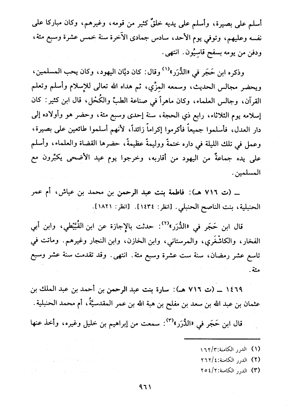 وذكره ابن حَجَر في "الدُّرَر" (¬1) وقال: كان ديَّان اليهود، وكان يحب المسلمين، ويحضر مجالس الحديث، وسمعه المِزِّي، ثم هداه الله تعالى للإِسلام وأسلم وتعلم القرآن، وجالس العلماء، وكان ماهرًا في صناعة الطبِّ والكُحْل، قال ابن كثير: كان إسلامه يوم الثلاثاء، رابع ذي الحجة، سنة إحدى وسبع مئة، وحضر هو وأولاده إلى دار العدل، فأسلموا جميعًا فأكرموا إكرامًا زائدًا، لأنهم أسلموا طائعين على بصيرة، وعمل في تلك الليلة في داره ختمةً ووليمةً عظيمةً، حضرها القضاة والعلماء، وأسلم على يده جماعةٌ من اليهود من أقاربه، وخرجوا يوم عيد الأضحى يكبِّرون مع المسلمين.