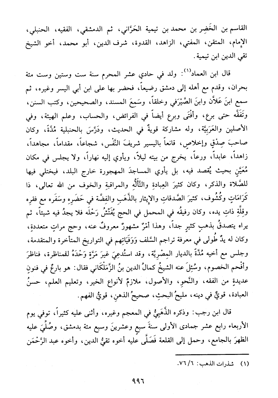 القاسم بن الخَضِر بن محمد بن تيمية الحَرَّاني، ثم الدمشقي، الفقيه، الحنبلي، الإِمام، المتقن، المفتي، الزاهد، القدوة، شرف الدين، أبو محمد، أخو الشيخ تقي الدين ابن تيمية.