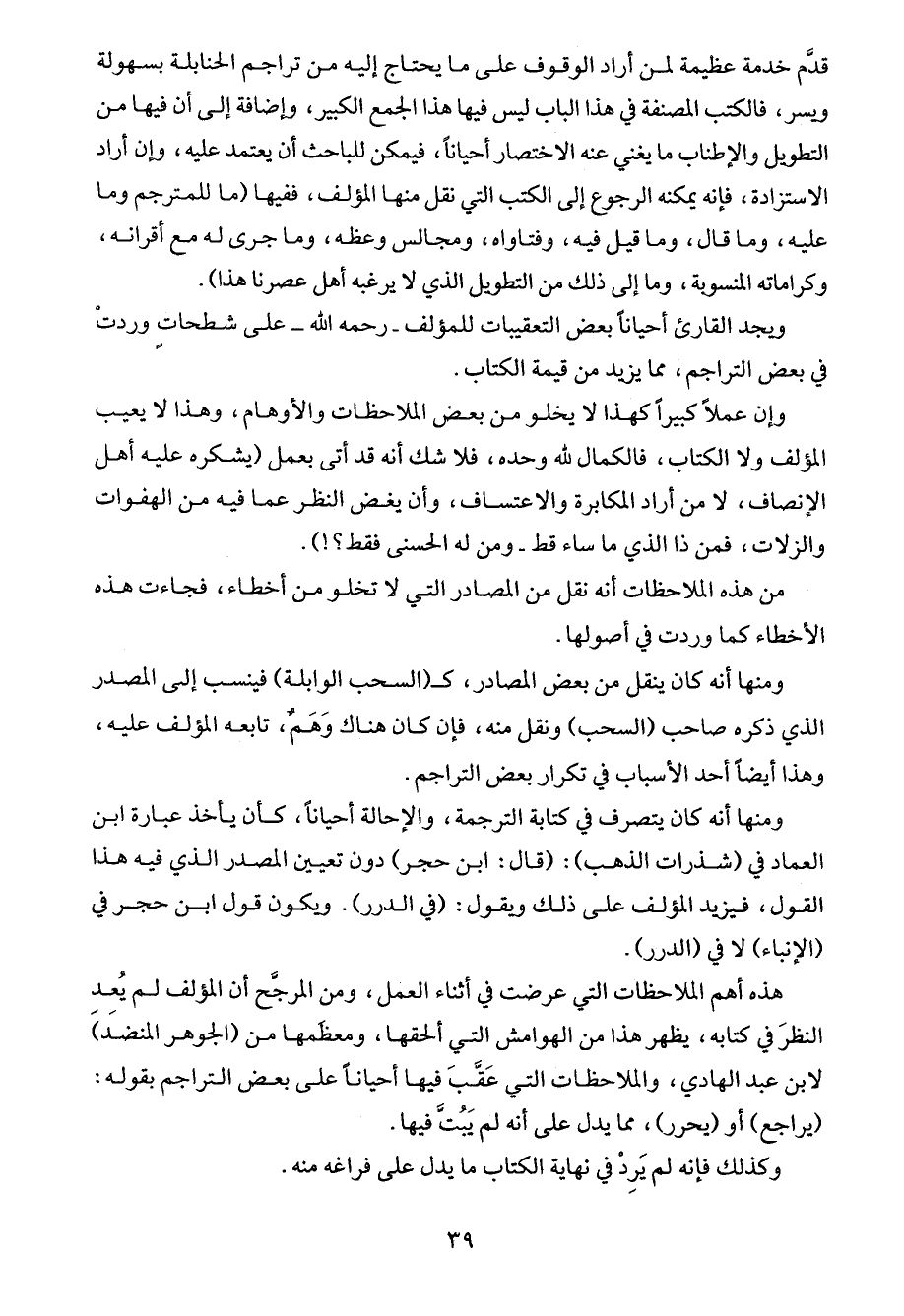 هذه أهم الملاحظات التي عرضت في أثناء العمل، ومن المرجَّح أن المؤلف لم يُعد النظرَ في كتابه، يظهر هذا من الهوامش التي ألحقها، ومعظَمها من (الجوهر المنضَد) لابن عبد الهادي، والملاحظات التي عَقَّبَ فيها أحيانًا على بعض التراجم بقوله: (يراجع) أو (يحرر)، مما يدل على أنه لم يَبُتَّ فيها.