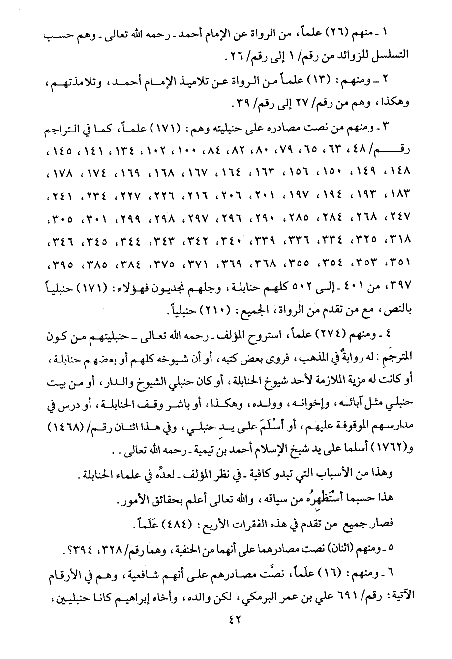 4 - ومنهم (274) علمًا، استروح المؤلف - رحمه الله تعالى - حنبليتهم من كون المترجَمِ: له روايةٌ في المذهب، فروى بعض كتبه، أو أن شيوخه كلهم أو بعضهم حنابلة، أو كانت له مزية الملازمة لأحد شيوخ الحنابلة، أو كان حنبلي الشيوخ والدار، أو من بيت حنبلي مثل آبائه، وإخوانه، وولده، وهكذا، أو باشر وقف الحنابلة، أو درس في مدارسهم الموقوفة عليهم، أو أسْلَمَ على يدِ حنبلي، وفي هذا اثنان رقم/ (1468) و (1762) أسلما على يد شيخ الإِسلام أحمد بن تيمية - رحمه الله تعالى -.
