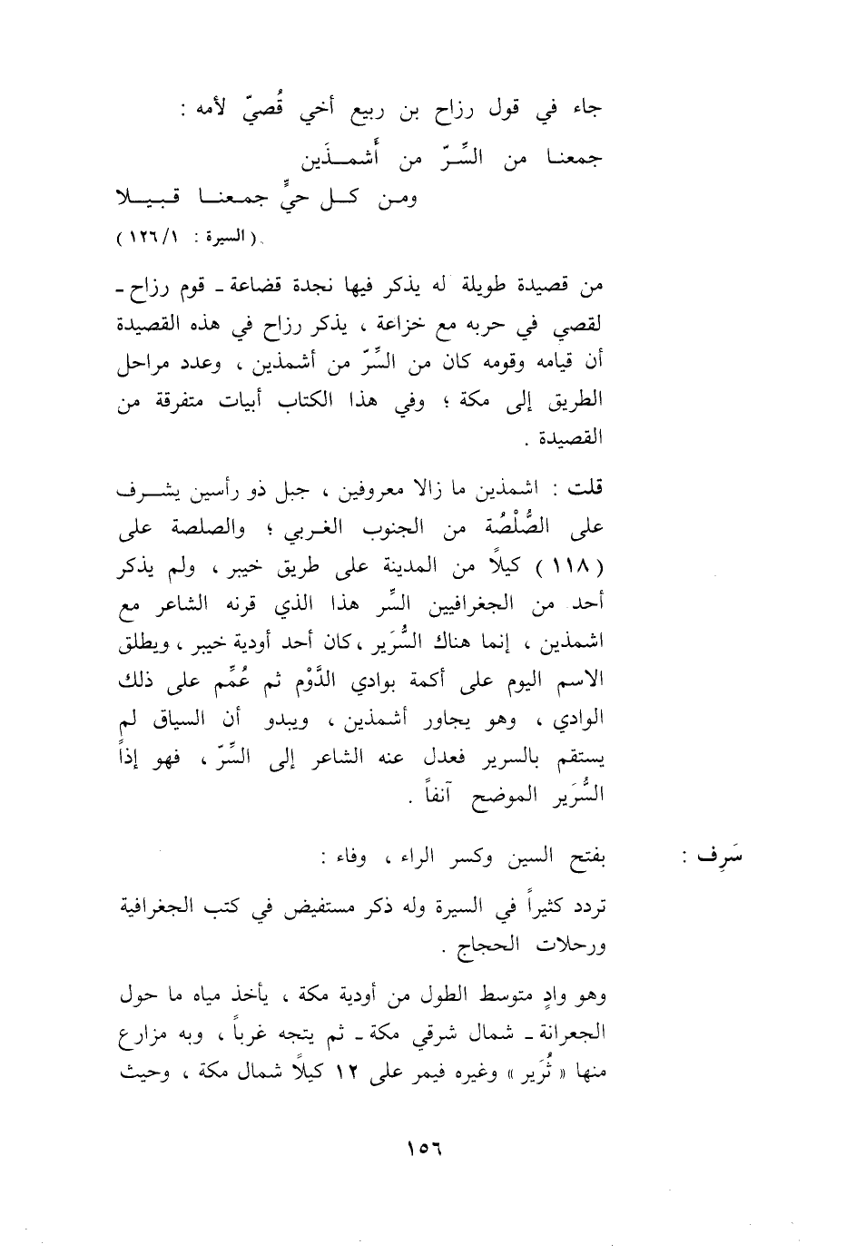 مِنْ قَصِيدَةٍ طَوِيلَةٍ لَهُ يَذْكُرُ فِيهَا نَجْدَةَ قُضَاعَةَ - قَوْمِ رَزَاحٍ - لِقُصَيِّ فِي حَرْبِهِ مَعَ خُزَاعَةَ، يَذْكُرُ رَزَاحُ فِي هَذِهِ الْقَصِيدَةِ أَنَّ قِيَامَهُ وَقَوْمَهُ كَانَ مِنْ السِّرِّ مِنْ أَشْمَذَيْنِ، وَعَدَدِ مَرَاحِلِ الطَّرِيقِ إلَى مَكَّةَ: وَفِي هَذَا الْكِتَابِ أَبْيَاتٌ مُتَفَرِّقَةٌ مِنْ الْقَصِيدَةِ. قُلْت. أَشْمَذَيْنِ مَا زَالَا مَعْرُوفَيْنِ، جَبَلٌ ذُو رَأْسَيْنِ يُشْرِفُ عَلَى الصُّلْصُلَةِ مِنْ الْجَنُوب الْغَرْبِيِّ: وَالصُّلْصُلَةُ عَلَى (118) كَيْلًا مِنْ الْمَدِينَةِ عَلَى طَرِيقِ خَيْبَرَ، وَلَمْ يَذْكُرْ أَحَدٌ مِنْ الْجُغْرَافِيِّينَ السِّرَّ هَذَا الَّذِي قَرَنَهُ الشَّاعِرُ مَعَ أَشْمَذَيْنِ، إنَّمَا هُنَاكَ السُّرَيْرُ، كَانَ أَحَدَ أَوْدِيَةِ خَيْبَرَ، وَيُطْلَقُ الِاسْمُ الْيَوْمَ عَلَى أَكَمَةٍ بِوَادِي الدَّوْمِ ثُمَّ عُمِّمَ عَلَى ذَلِكَ الْوَادِي، وَهُوَ يُجَاوِرُ أَشْمَذَيْنِ، وَيَبْدُو أَنَّ السِّيَاقَ لَمْ يَسْتَقِمْ بِالسُّرَيْرِ فَعَدَلَ عَنْهُ الشَّاعِرُ إلَى السِّرِّ، فَهُوَ إذًا السُّرَيْرُ الْمُوَضَّحُ آنِفًا.