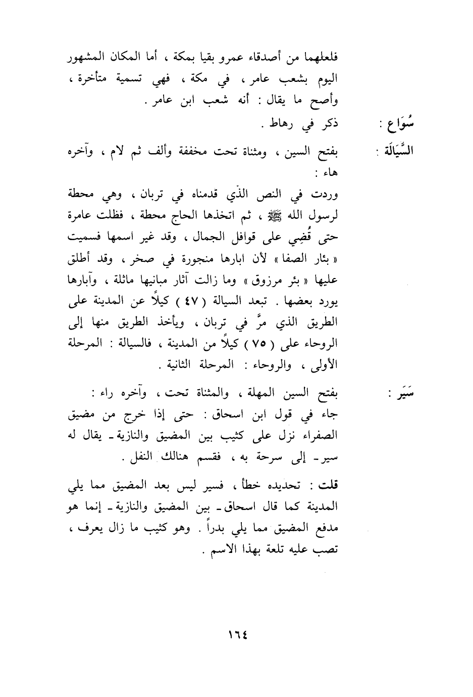 قُلْت: تَحْدِيدُهُ خَطَأٌ، فَسَيَرٌ لَيْسَ بَعْدَ الْمَضِيقِ مِمَّا يَلِي الْمَدِينَةَ كَمَا قَالَ إسْحَاقُ - بَيْنَ الْمَضِيقِ وَالنَّازِيَةِ - إنَّمَا هُوَ مَدْفَعُ الْمَضِيقِ مِمَّا يَلِي بَدْرًا. وَهُوَ كُثَيْبٌ مَا زَالَ يُعْرَفُ، تَصُبُّ عَلَيْهِ تَلْعَةُ بِهَذَا الِاسْمِ.