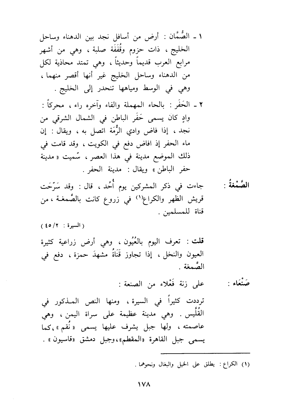 قُلْت: تُعْرَفُ الْيَوْمَ بِالْعُيُونِ، وَهِيَ أَرْضٌ زِرَاعِيَّةٌ كَثِيرَةُ الْعُيُونِ وَالنَّخْلِ، إذَا تَجَاوَزَ قَنَاةَ مَشْهَدِ حَمْزَةَ، دَفَعَ فِي الصَّمْغَةِ.