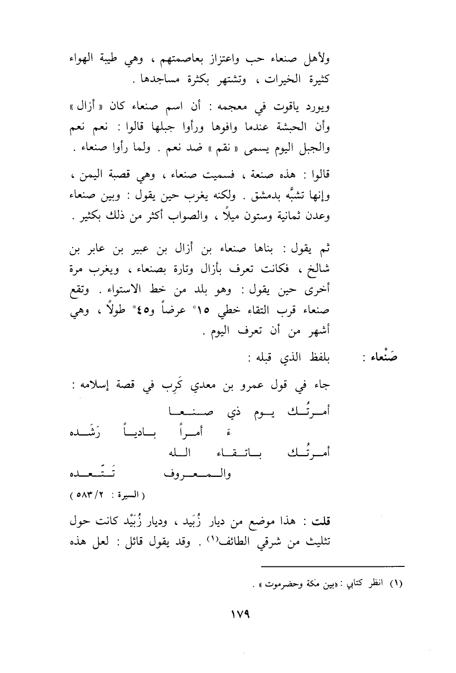 ثُمَّ يَقُولُ: بَنَاهَا صَنْعَاءُ بْنُ أَزَالَ بْنِ عَبِيرِ بْنِ عَابِرِ بْنِ شالخ، فَكَانَتْ تُعْرَفُ بِأَزَالَ وَتَارَةً بِصَنْعَاءَ، وَيُغْرِبُ مَرَّةً أُخْرَى حِينَ يَقُولُ: وَهُوَ بَلَدٌ مِنْ خَطِّ الِاسْتِوَاءِ. وَتَقَعُ صَنْعَاءُ قُرْبَ الْتِقَاءِ خَطَّيْ 15 عَرْضًا و45 طُولًا، وَهِيَ أَشْهَرُ مِنْ أَنْ تُعْرَفَ الْيَوْمَ.