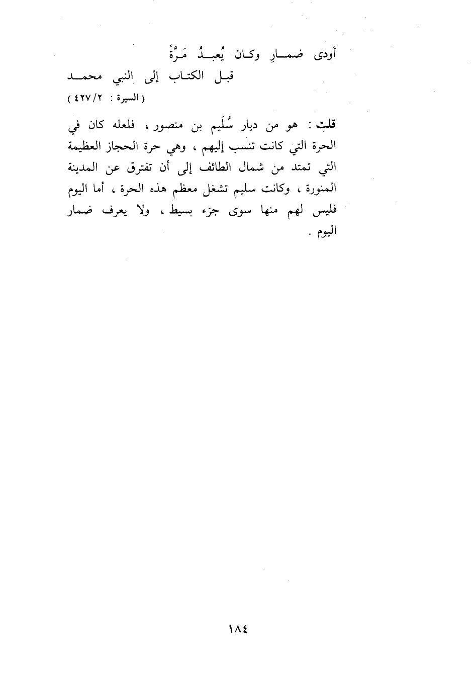 قُلْت: هُوَ مِنْ دِيَارِ سُلَيْمِ بْنِ مَنْصُورٍ، فَلَعَلَّهُ كَانَ فِي الْحَرَّةِ الَّتِي كَانَتْ تُنْسَبُ إلَيْهِمْ، وَهِيَ حَرَّةُ الْحِجَازِ الْعَظِيمَةِ الَّتِي تَمْتَدُّ مِنْ شَمَالِ الطَّائِفِ إلَى أَنْ تَفْتَرِقَ عَنْ الْمَدِينَةِ الْمُنَوَّرَةِ، وَكَانَتْ سُلَيْمٌ تَشْغَلُ مُعْظَمَ هَذِهِ الْحَرَّةِ، أَمَّا الْيَوْمُ فَلَيْسَ لَهُمْ مِنْهَا سِوَى جُزْءٍ بَسِيطٍ، وَلَا يُعْرَفُ ضَمَارِ الْيَوْمَ.