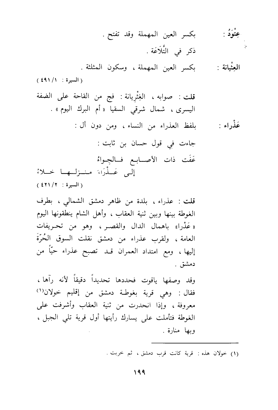 قُلْت: عَذْرَاءُ، بَلْدَةٌ مِنْ ظَاهِرِ دِمَشْقَ الشَّمَالِيِّ، بِطَرَفِ الْغُوطَةِ بَيْنَهَا وَبَيْنَ ثَنِيَّةِ الْعُقَابِ، وَأَهْلُ الشَّامِ يَنْطِقُونَهَا الْيَوْمَ «عَدْرَا» بِإِهْمَالِ الدَّالِ وَالْقَصْرِ، وَهُوَ مِنْ تَحْرِيفَاتِ الْعَامَّةِ، وَلِقُرْبِ عَذْرَاءَ مِنْ دِمَشْقَ نُقِلَتْ السُّوقُ الْحُرَّةُ إلَيْهَا، وَمَعَ امْتِدَادِ الْعُمْرَانِ قَدْ تُصْبِحُ عَذْرَاءَ حَيًّا مِنْ دِمَشْقَ.