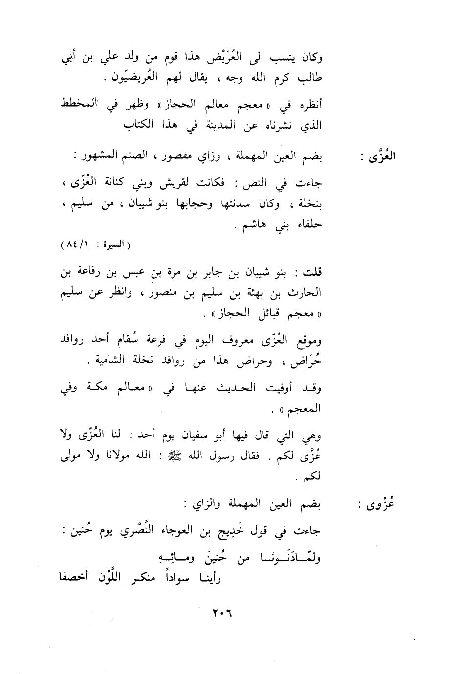 وَقَدْ أَوْفَيْت الْحَدِيثَ عَنْهَا فِي «مَعَالِمِ مَكَّةَ وَفِي الْمُعْجَمِ». وَهِيَ الَّتِي قَالَ فِيهَا أَبُو سُفْيَانَ يَوْمَ أُحُدٍ: لَنَا الْعُزَّى وَلَا عُزَّى لَكُمْ. فَقَالَ رَسُولُ اللَّهِ صَلَّى اللَّهُ عَلَيْهِ وَسَلَّمَ: اللَّهُ مَوْلَانَا وَلَا مَوْلَى لَكُمْ.