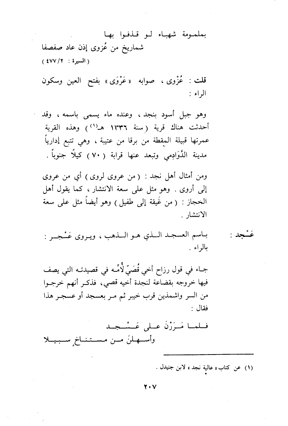 قُلْت: عُزْوَى، صَوَابُهُ «عَرْوَى» بِفَتْحِ الْعَيْنِ وَسُكُونِ الرَّاءِ: وَهُوَ جَبَلٌ أَسْوَدُ بِنَجْدِ، وَعِنْدَهُ مَاءٌ يُسَمَّى بِاسْمِهِ، وَقَدْ أُحْدِثَتْ هُنَاكَ قَرْيَةً (سَنَةَ 1336 هـ) وَهَذِهِ الْقَرْيَةُ عَمَرَتْهَا قَبِيلَةُ الْمِقَطَّةِ مِنْ بَرْقَا مِنْ عُتَيْبَةَ، وَهِيَ تَتْبَعُ إدَارِيًّا مَدِينَةَ الدَّوَادِمِيِّ وَتَبْعُدُ عَنْهَا قُرَابَةَ (70) كَيْلًا جَنُوبًا.