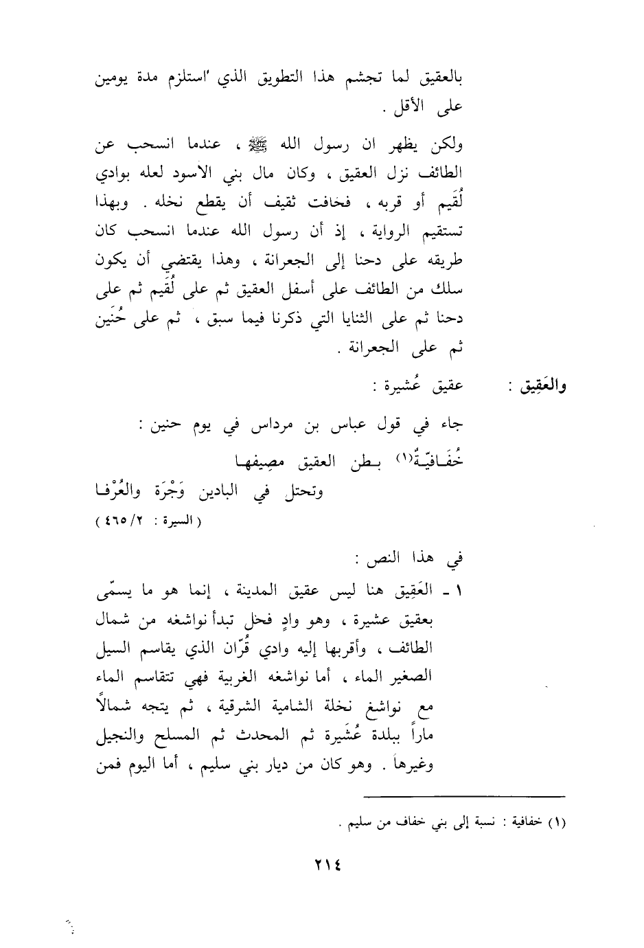 فِي هَذَا النَّصِّ: 1 - الْعَقِيقُ هُنَا لَيْسَ عَقِيقَ الْمَدِينَةِ، إنَّمَا هُوَ مَا يُسَمَّى بِعَقِيقِ عُشَيْرَةٍ، وَهُوَ وَادٍ >>>>>> الأماكن"> فَحْلٌ الطَّائِفِ وَادِي قُرَّانَ السَّيْلَ الصَّغِيرَ نَخْلَةَ الشَّامِيَّةِ عُشَيْرَةٍ الْمُحَدَّثِ الْمُسْلِحِ وَالنَّجِيلِ وَغَيْرِهَا. وَهُوَ كَانَ مِنْ دِيَارِ بَنِي سُلَيْمٍ، أَمَّا الْيَوْمَ فَمِنْ