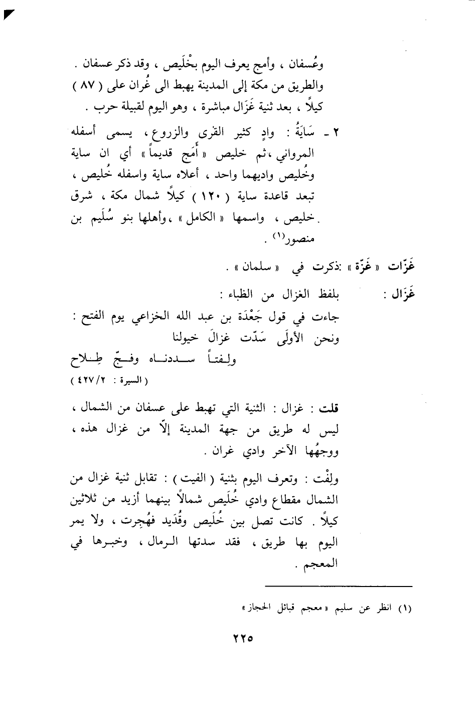قُلْت: غَزَالٌ: الثَّنِيَّةُ الَّتِي تَهْبِطُ عَلَى عُسْفَانَ مِنْ الشَّمَالِ، لَيْسَ لَهُ طَرِيقٌ مِنْ جِهَةِ الْمَدِينَةِ إلَّا مِنْ غَزَالٍ هَذِهِ، وَوَجْهُهَا الْآخَرُ وَادِي غُرَانَ.