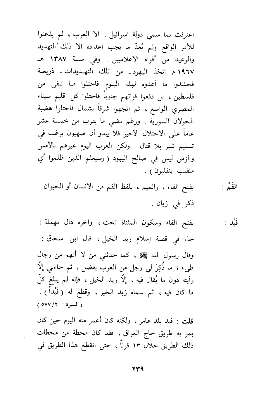 قُلْت: فَيْدٌ بَلَدُ عَامِرٍ، وَلَكِنَّهُ كَانَ أَعْمَرَ مِنْهُ الْيَوْمَ حِينَ كَانَ يَمُرُّ بِهِ طَرِيقُ حَاجِّ الْعِرَاقِ، فَقَدْ كَانَ مَحَطَّةً مِنْ مَحَطَّاتِ ذَلِكَ الطَّرِيقِ خِلَالَ 13 قَرْنًا، حَتَّى انْقَطَعَ هَذَا الطَّرِيقُ فِي