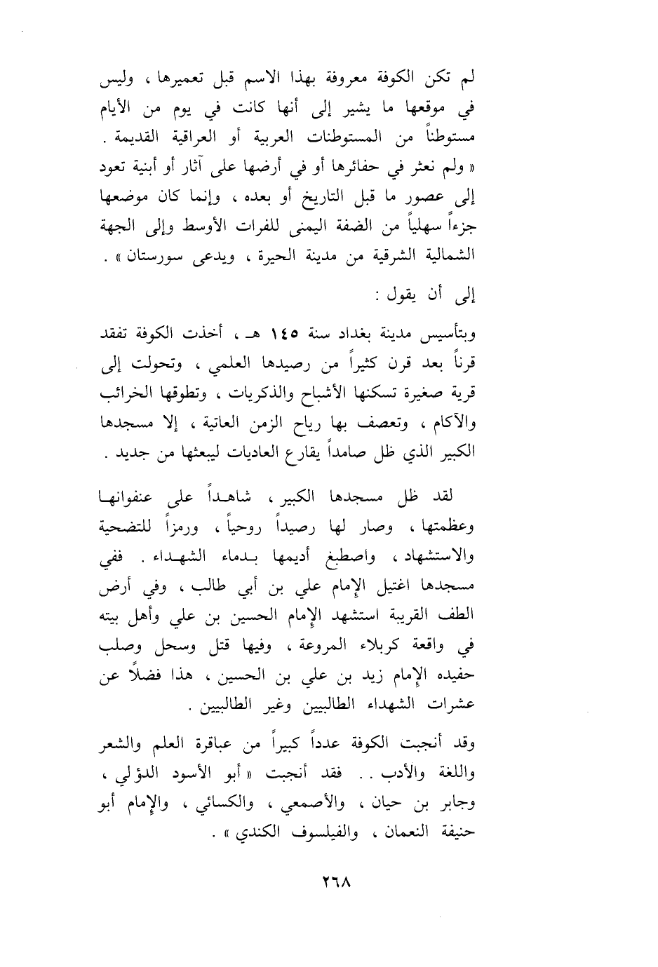 وَقَدْ أَنْجَبَتْ الْكُوفَةُ عَدَدًا كَبِيرًا مِنْ عَبَاقِرَةِ الْعِلْمِ وَالشِّعْرِ وَاللُّغَةِ وَالْأَدَبِ. . فَقَدْ أَنْجَبَتْ «أَبَا الْأَسْوَدِ الدُّؤَلِيّ، وَجَابِرَ بْنَ حَيَّانَ، وَالْأَصْمَعِيَّ، وَالْكِسَائِيَّ، وَالْإِمَامَ أَبَا حَنِيفَةَ النُّعْمَانَ، وَالْفَيْلَسُوفَ الْكِنْدِيَّ».
